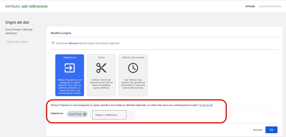 Devi creare due regole sperate, la prima per l’attributo ads_redirect e la seconda per l’attributo display_ads_link. Nella sezione MODIFICA ORIGINA seleziona il box imposta su e nel campo sottostante seleziona l’attributo NomeFeed.link.
