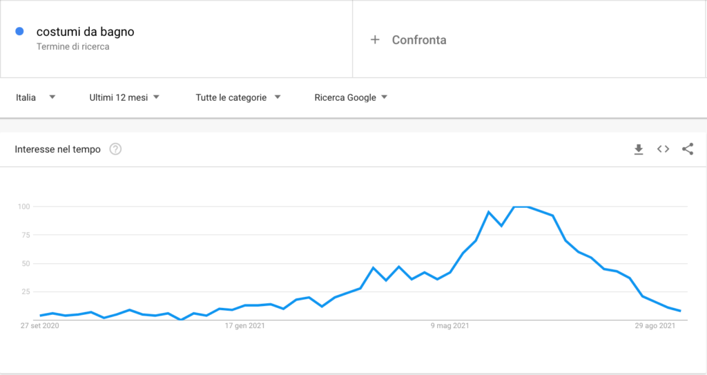 Un ecommerce specializzato in costumi da bagno avrà inevitabilmente una richiesta maggiore nel periodo pre-estivo ed estivo. In questo caso abbiamo preso come esempio l’Italia, quindi vediamo un aumento dell’interesse da aprile, con un picco verso giugno.
